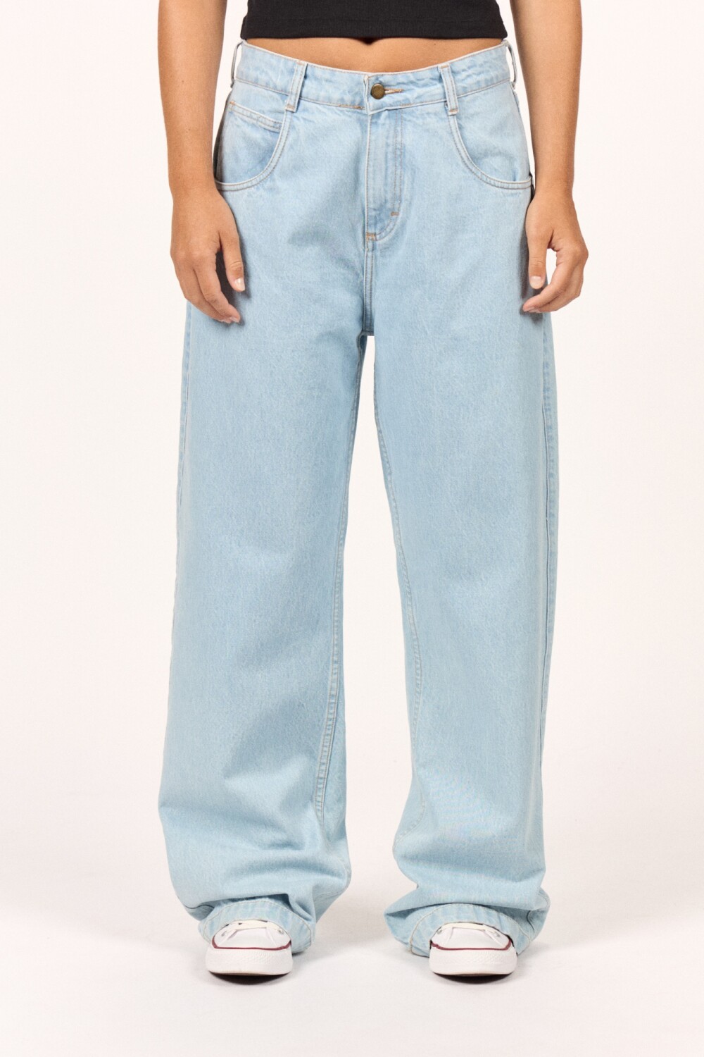 Jean celeste baggy wide tiro medio, 5 bolsillos, con desgastado de color, posee