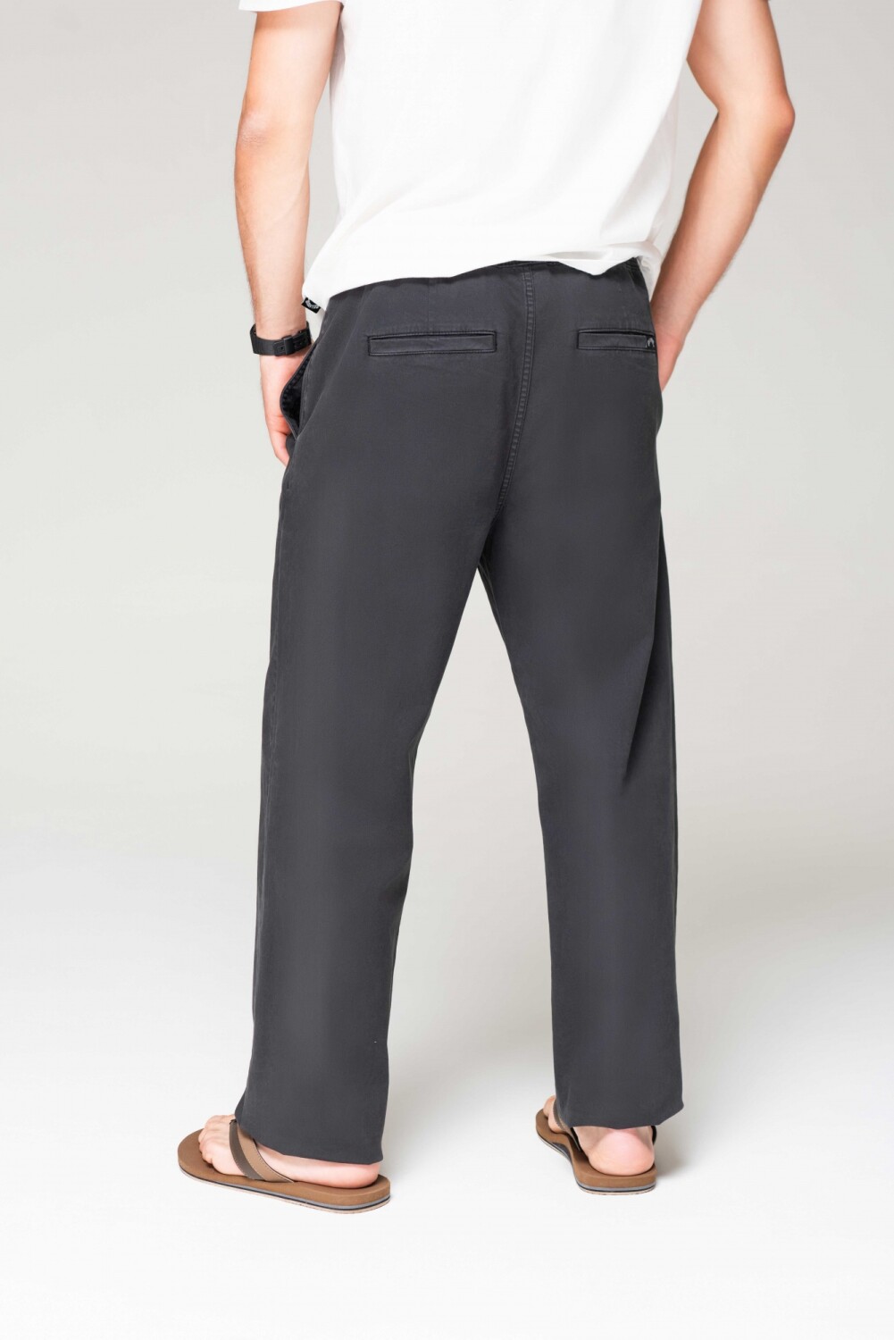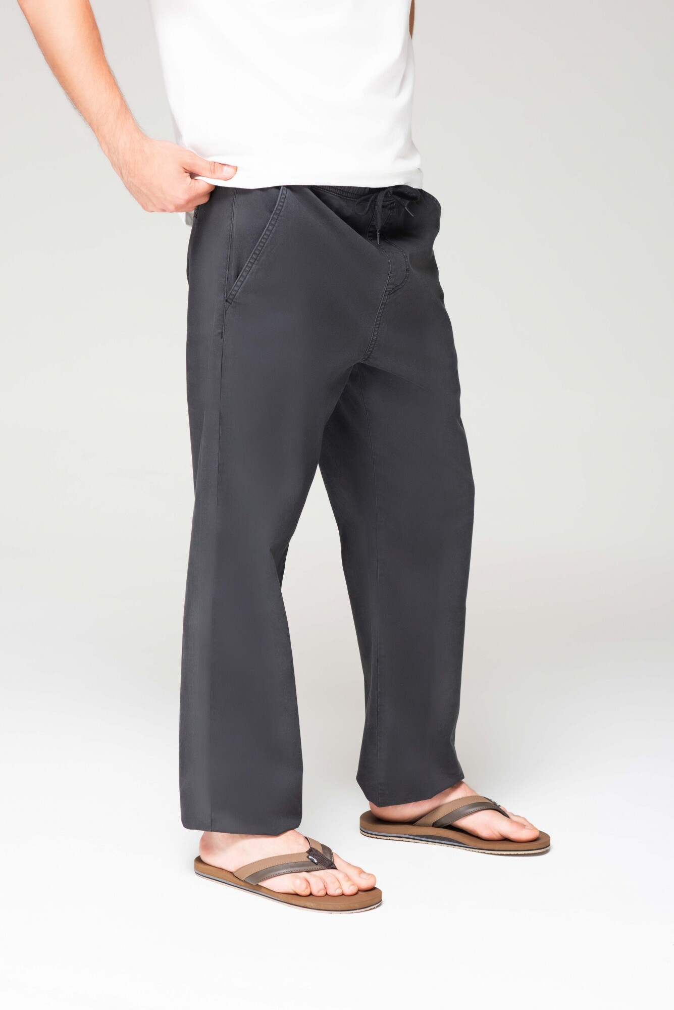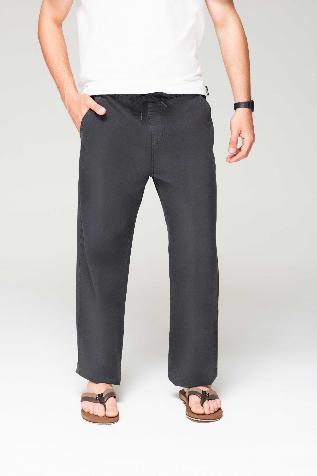 Pantalón de gabardina teñido en prenda, con cintura elastizada, bolsillos llaterales