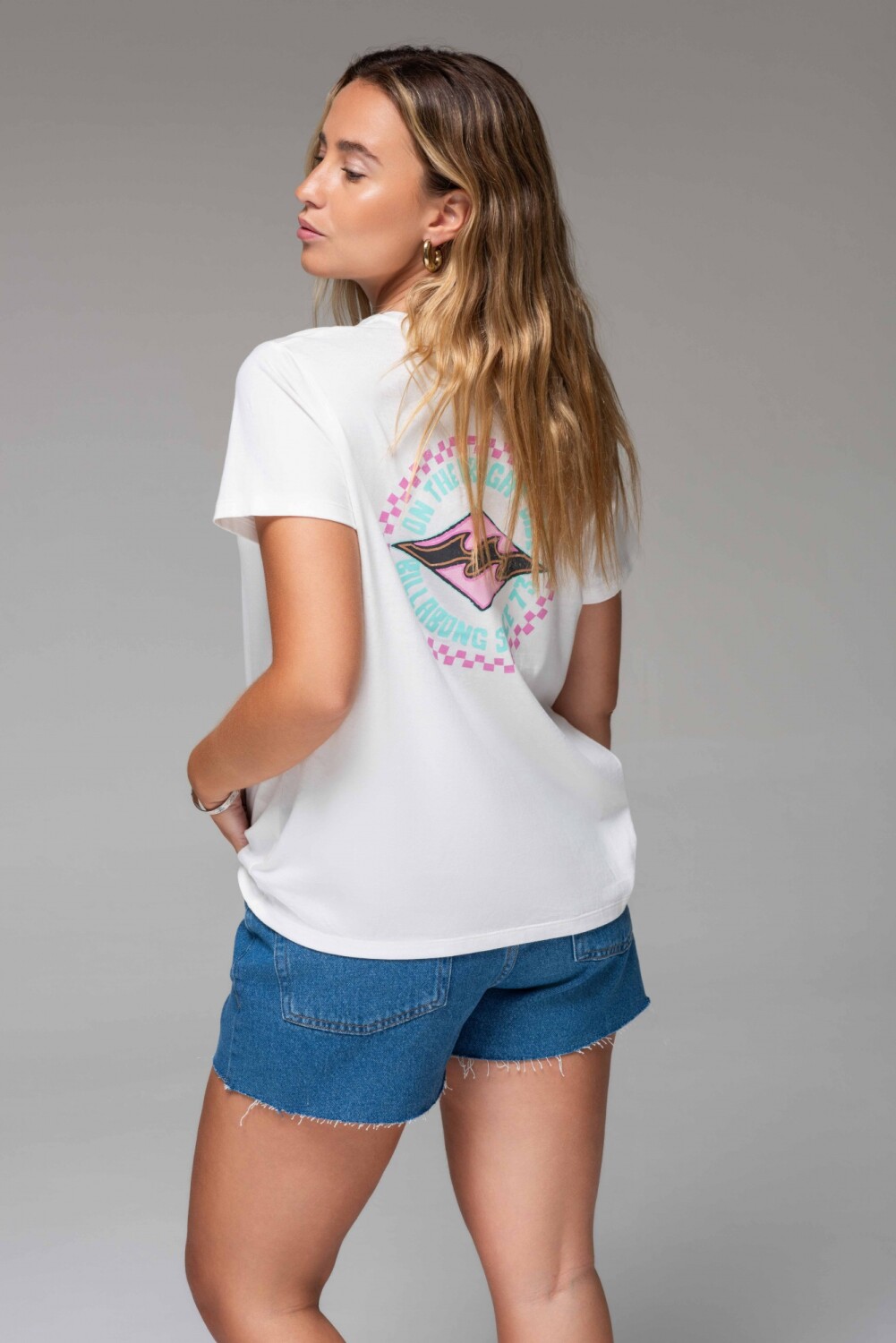 $ 1.182 Remera calce clasico, cuello redondo, mangas cortas. Estampado en frente y espalda. Grifa librito de marca en lateral.