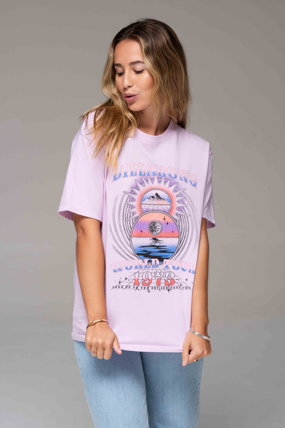 $ 1.267 Remera calce oversize, cuello redondo, mangas cortas. Posee estampa de arte